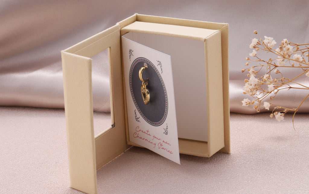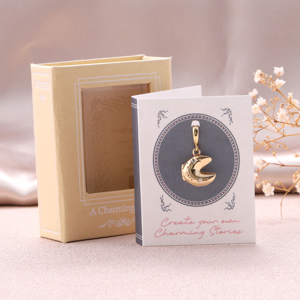 Therefore, we pack our little story charms in a little book cover box. We hand make each single book insert using 100%recyclable card stock. The 14k gold plated charm hang elegantly on the book cover. You may write a little message or even a story inside the book for you or the loved ones to cherish forever.