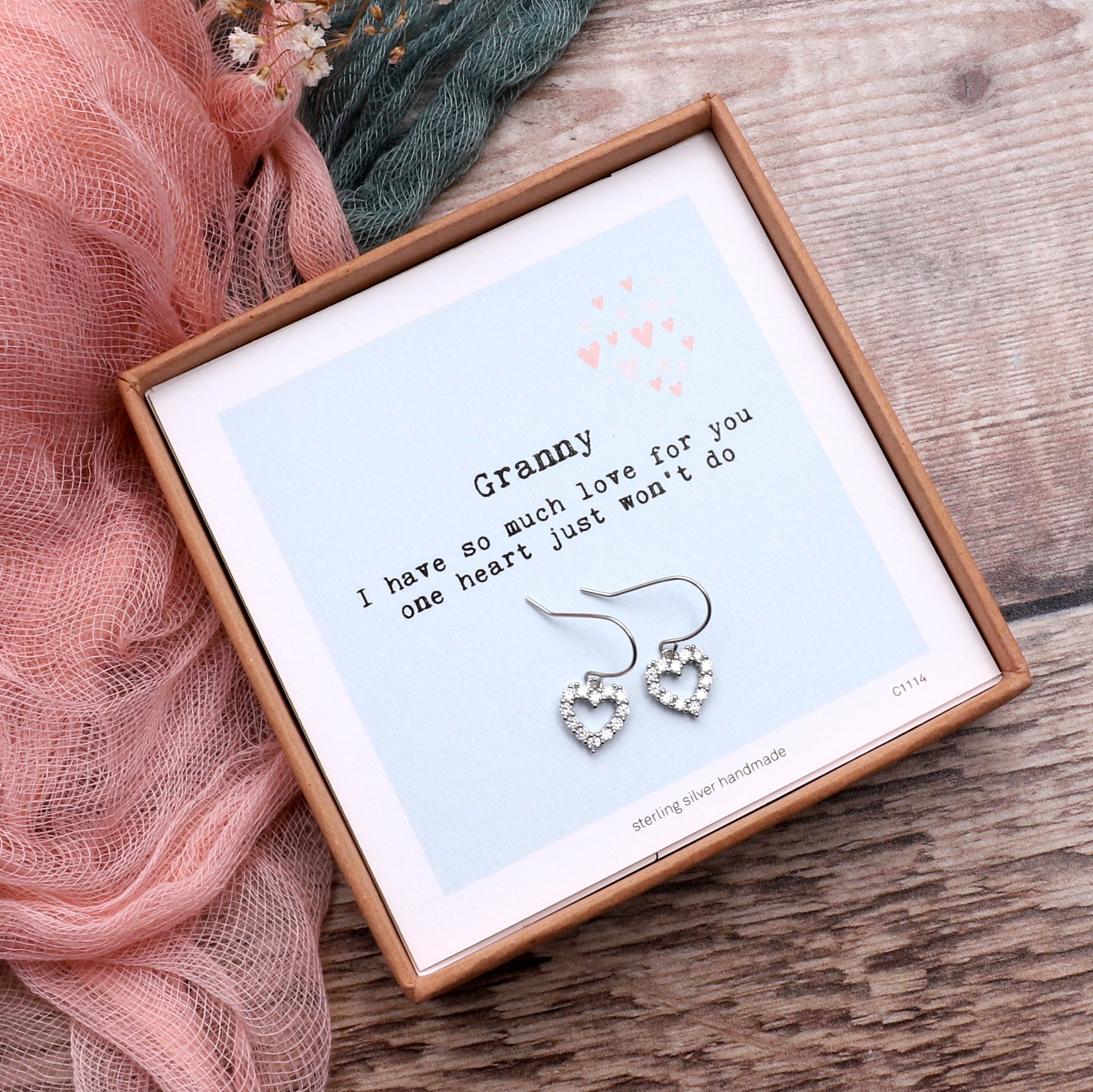 Charming gift boxed heart drop earrings, presented on a card with a little poem of love for your gran.
