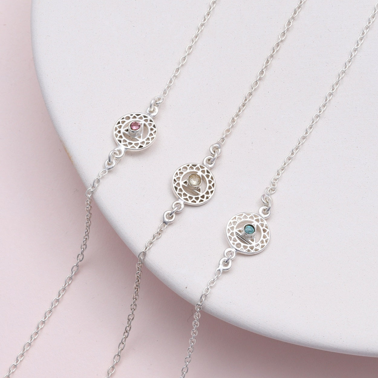 These beautiful birthstone bracelets are a wonderful way to keep a little bit of you around your wrist. Featuring a 1 cm (0.39″) mandala style pendant with your birthstone neatly set in the centre, this will add a little sparkle to any outfit.