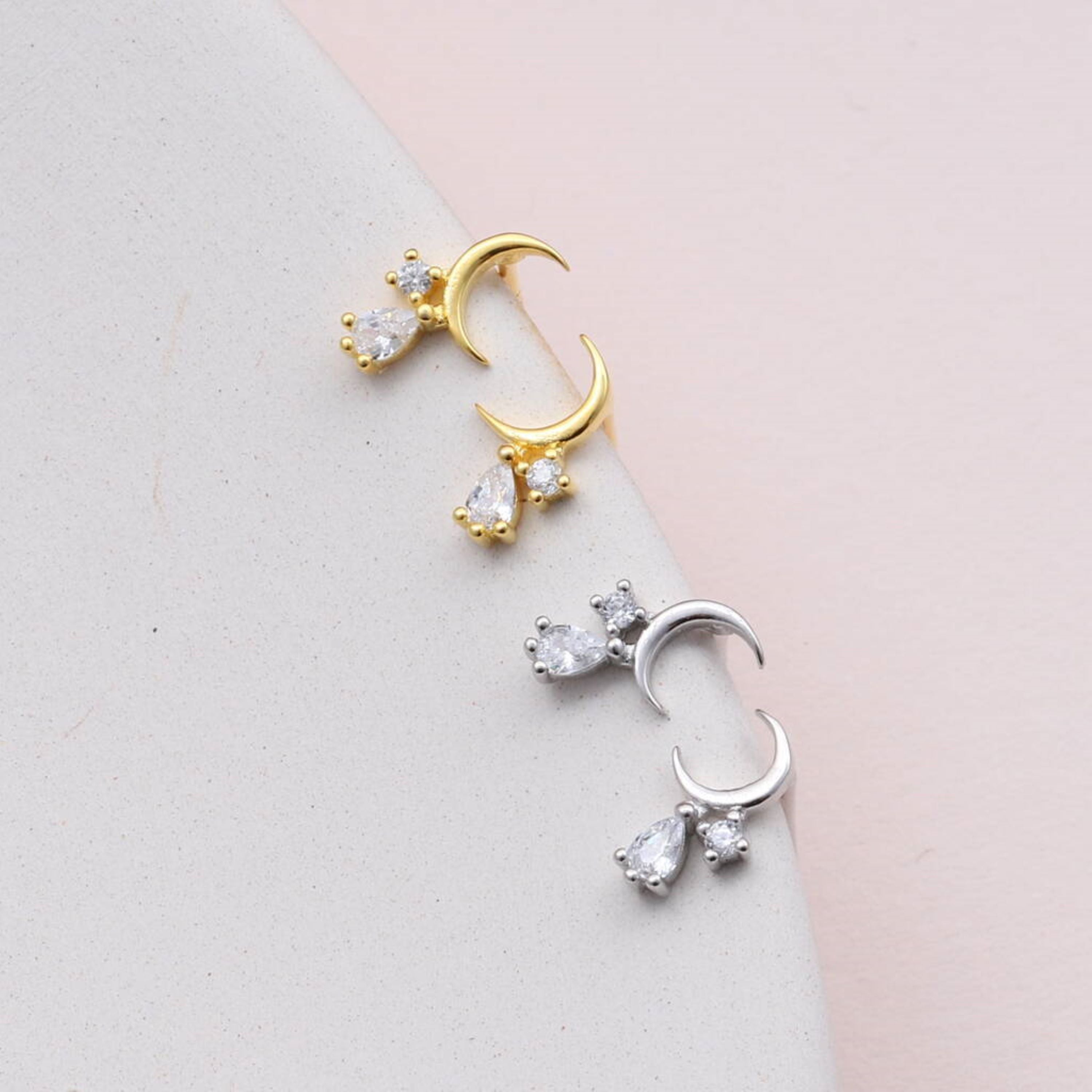 Gorgeous sterling silver moon stud earrings, complete with little crystals. These earrings come in a silver or gold colour and are presented on a card that reads "There is no magic like yours" and in a cotton drawstring bag.