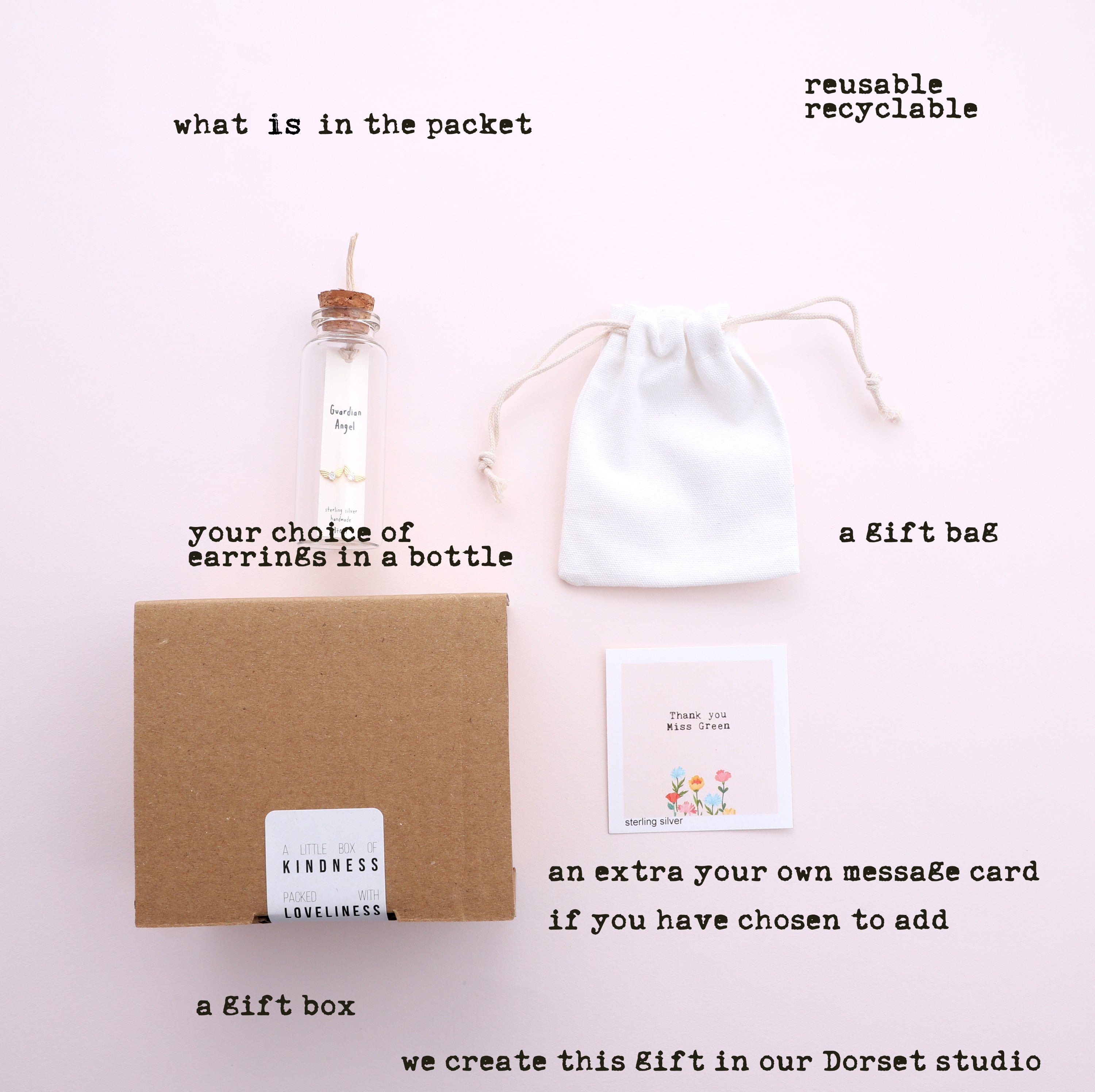 - The earrings are packaged in a glass bottle with a cotton bag and in a kraft gift box.